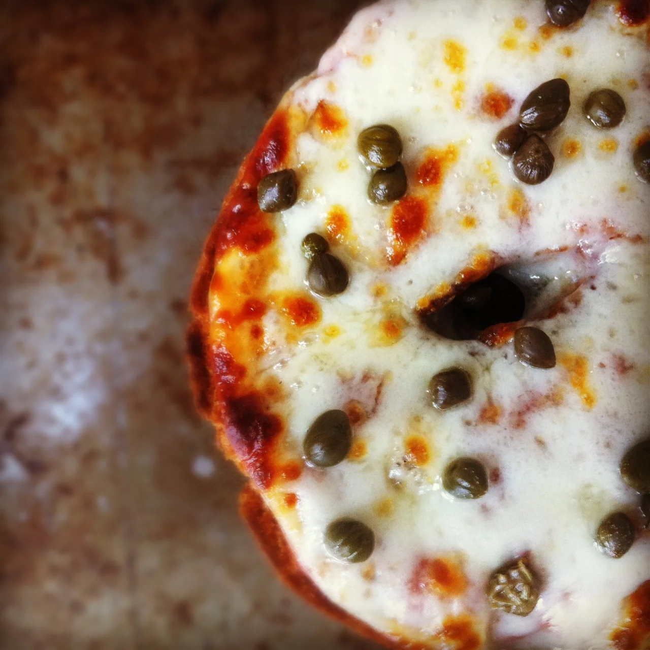 It's simple to make: toast a bagel (in this case a gluten-free bagel), pile on red sauce, top with one slice of provolone cheese. Broil for a few minutes until the cheese starts to bubble and brown. Finish it off with a few capers.