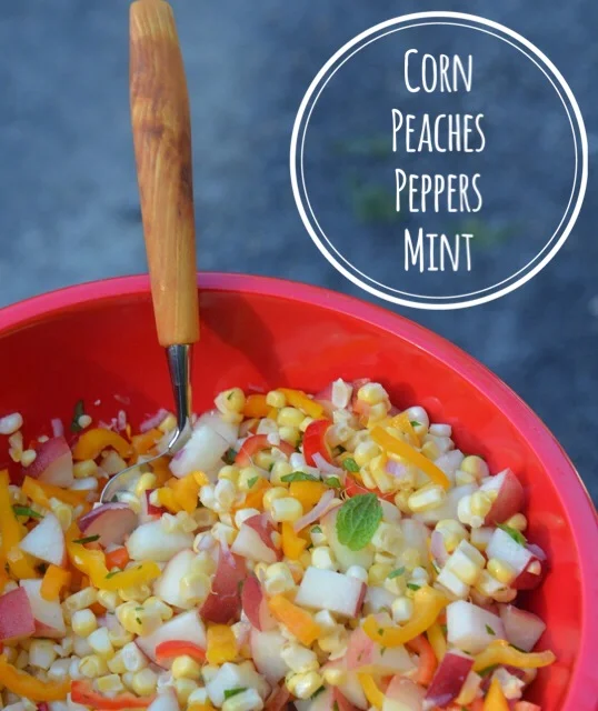 We’d return from training each day to find a variety of fruits and vegetables on the kitchen island. Then somehow Bec would magically produce a delicious dinner spread. I don’t know where she found the energy after a long day of swimming, biking and running. I’d be off in the backyard with my feet up, trying to recover, and would come in to find a dinner completely made. Every night she claimed, “it was nothing” and the cooking was simple. I challenged her on that…so she gave me this corn and peach salad recipe to try.